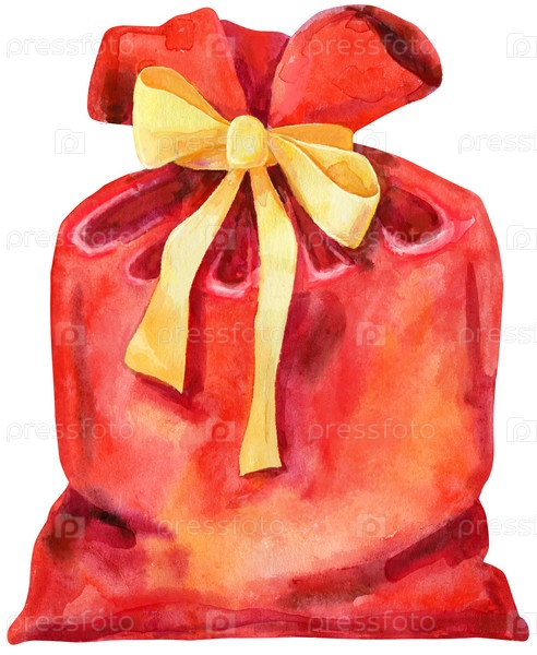 Полный подарок закрытый Санта Клаус красный мешок. Акварельная иллюстрация