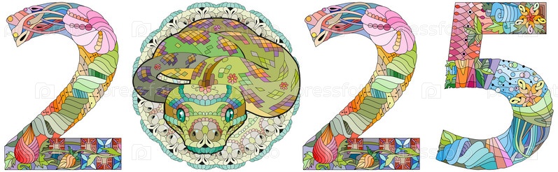 Зентангл стилизованная змея номер 2025. Нарисованная вручную кружевная векторная иллюстрация