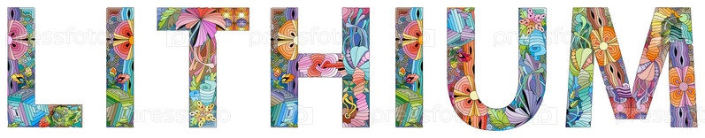Слово ЛИТИЙ. Литий — мягкий, серебристо-белый щелочной металл. Векторный декоративный зентангл-объект для украшения