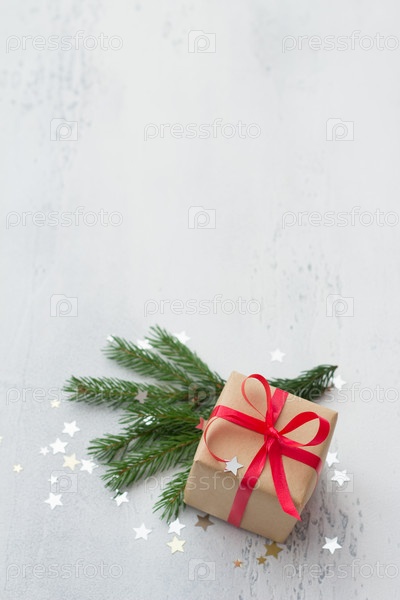 Небольшой подарок, упакованный в крафт-бумагу с красной лентой на светло-голубом фоне с натуральными ветками рождественской елки, окруженный блестящей звездой-конфетти. Рождественский фон, праздничный фон