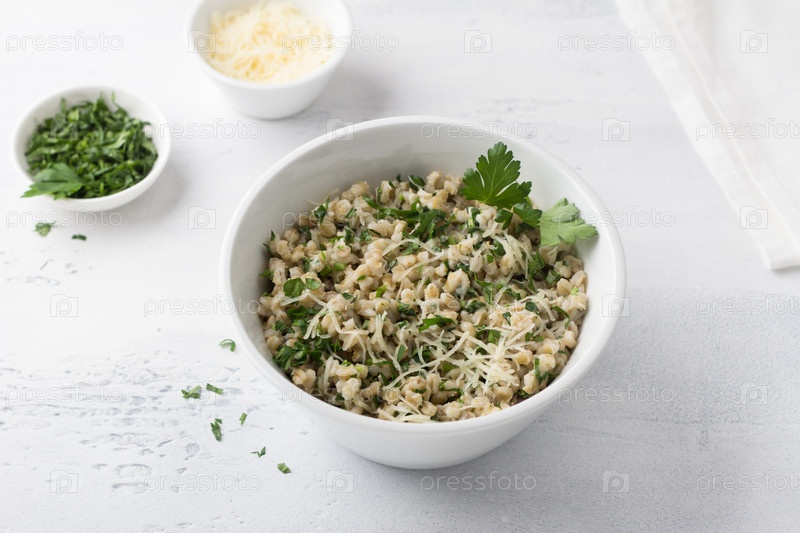 Перловая крупа с сыром и зеленью в белой керамической миске на светло-сером фоне, вид сверху. Вкусный и полезный завтрак