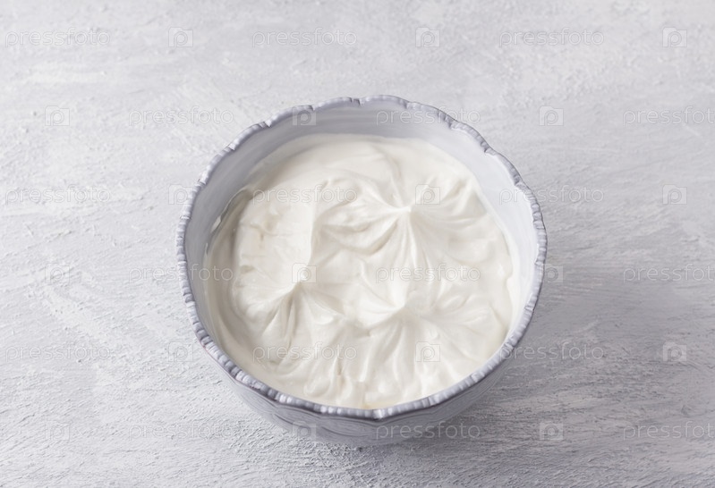 Серая миска со взбитыми сливками для приготовления десерта Павлова на светло-сером фоне