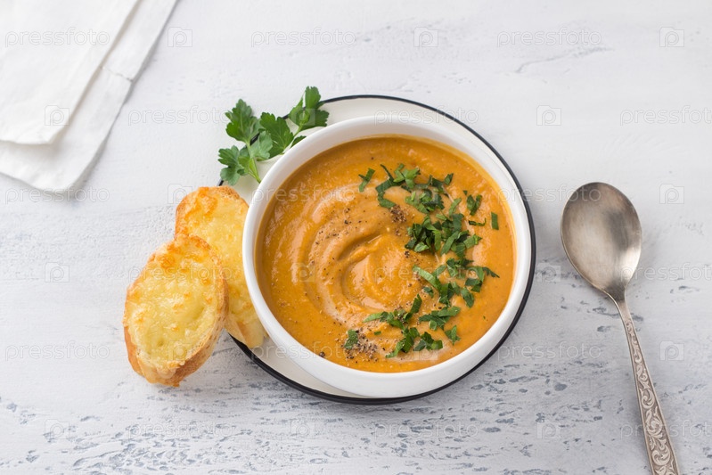 Чечевичный крем-суп с петрушкой и сырными гренками на светло-голубом фоне