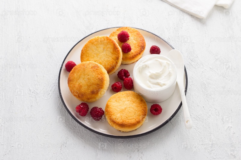 Вкусные полезные запеченные кето-сырники с кокосовой мукой, подаются со сметаной и малиной на светло-сером фоне