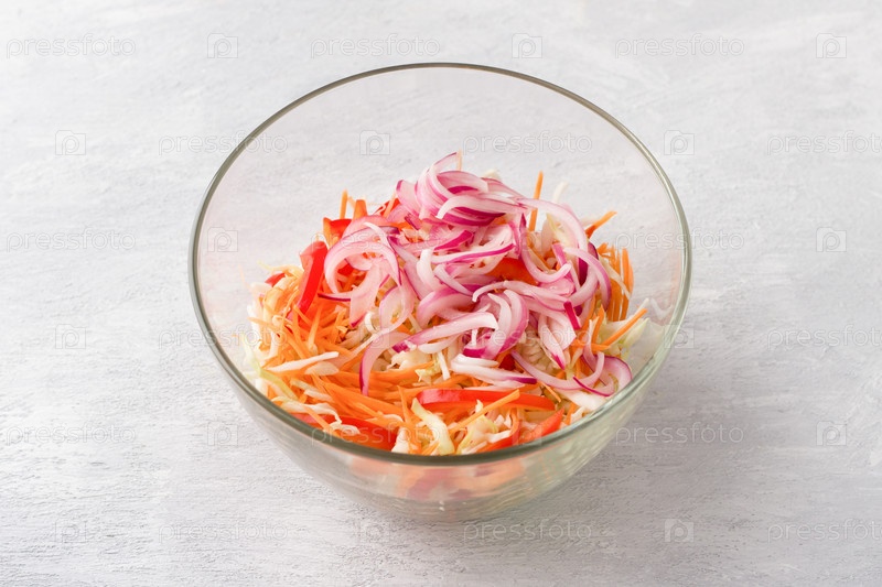 Стеклянная миска с нашинкованной капустой, тертой морковью, нарезанным сладким перцем и маринованными перьями красного лука на светло-сером фоне. Готовим вкусный домашний салат