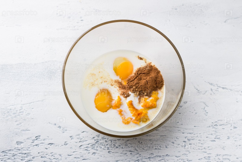 Стеклянная миска с молоком, яйцами, пюре из тыквы, специями на светло-голубом столе, вид сверху. Этап приготовления домашних тыквенных сухариков