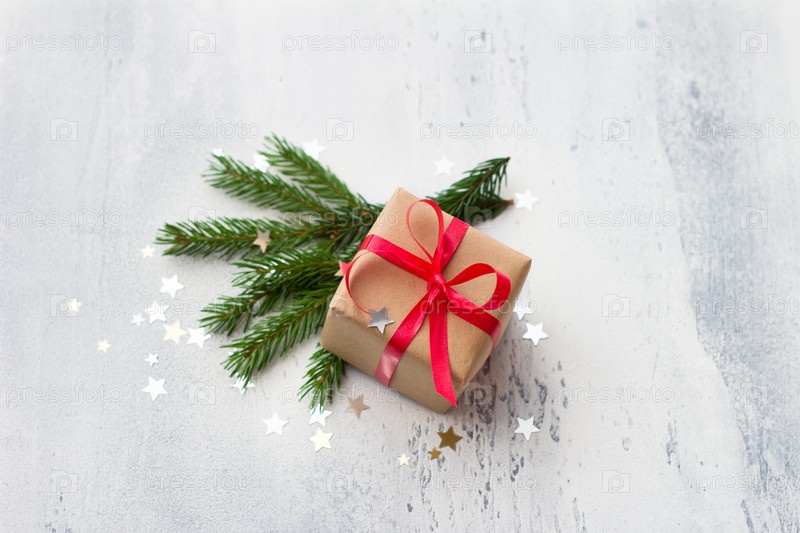 Небольшой подарок, упакованный в крафт-бумагу с красной лентой на светло-голубом фоне с натуральными ветками рождественской елки, окруженный блестящей звездой-конфетти. Рождественский фон, праздничный фон