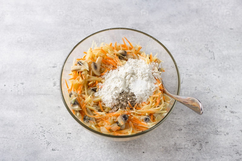 Стеклянная миска со смесью тертого картофеля, моркови, яиц, жареных грибов с луком и муки со специями для приготовления вкусного картофельного пирога, гратена или запеканки на сером фактурном фоне, вид сверху