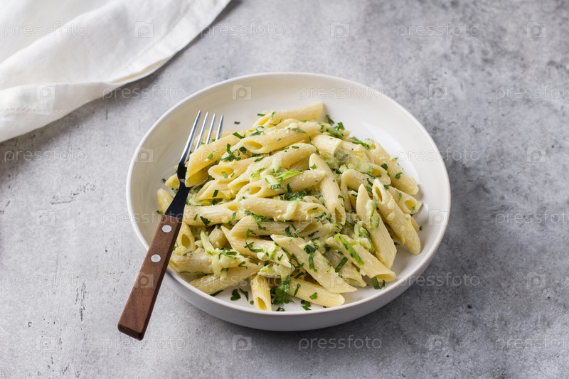 Паста пенне с цуккини, сливочным сыром и зеленью на сером текстурированном фоне, вид сверху. Вегетарианская еда, домашняя здоровая еда