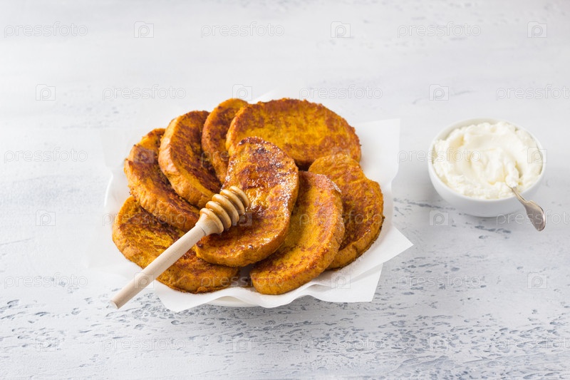 Сладкий тыквенный тост с медом и сливками, посыпанный сахарной пудрой на светло-голубом текстурированном фоне. Вкусный домашний завтрак