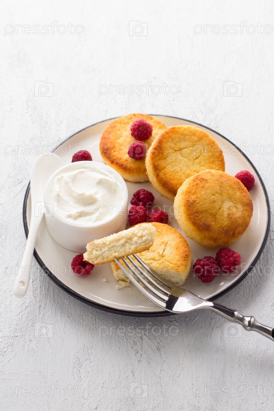 Вкусные полезные запеченные кето-сырники с кокосовой мукой, подаются со сметаной и малиной на светло-сером фоне