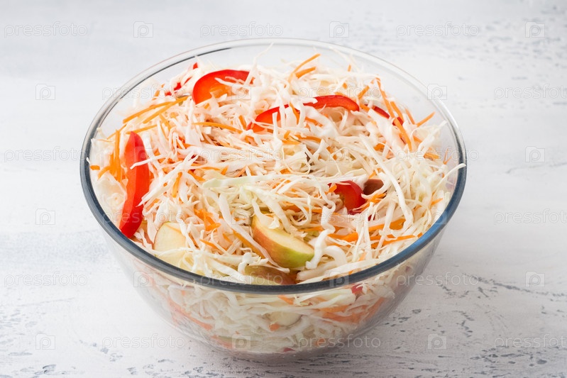 Стеклянная миска с нашинкованной капустой с тертой морковью, яблоками и сладким перцем на светло-сером фоне. Готовим вкусную домашнюю еду
