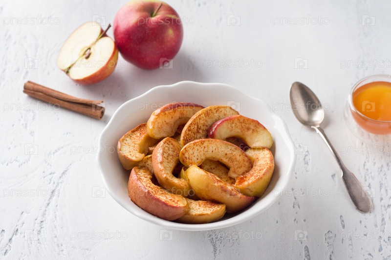 Белая миска с печеными яблочными ломтиками с корицей на светло-голубом фоне. Вкусный домашний веганский десерт