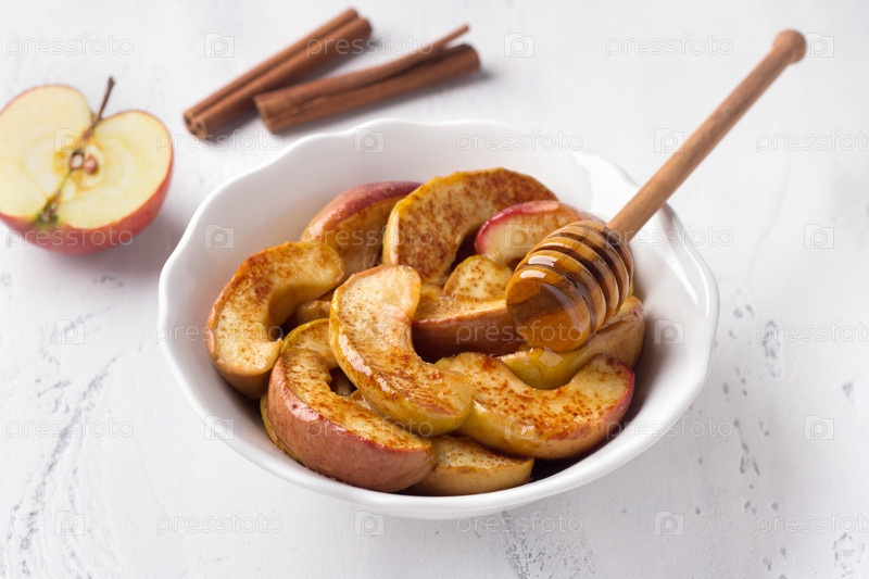 Белая миска с печеными яблочными ломтиками с корицей на светло-голубом фоне. Вкусный домашний веганский десерт