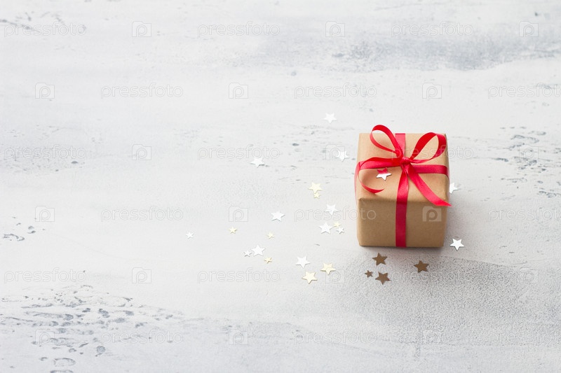 Небольшой подарок, упакованный в крафт-бумагу с красной лентой на светло-голубом фоне с натуральными ветками рождественской елки, окруженный блестящей звездой-конфетти. Рождественский фон, праздничный фон