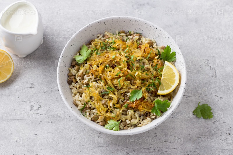 Традиционное блюдо Ближнего Востока, муджадара из чечевицы, риса и жареного лука с лимоном и зеленью на светло-сером фоне