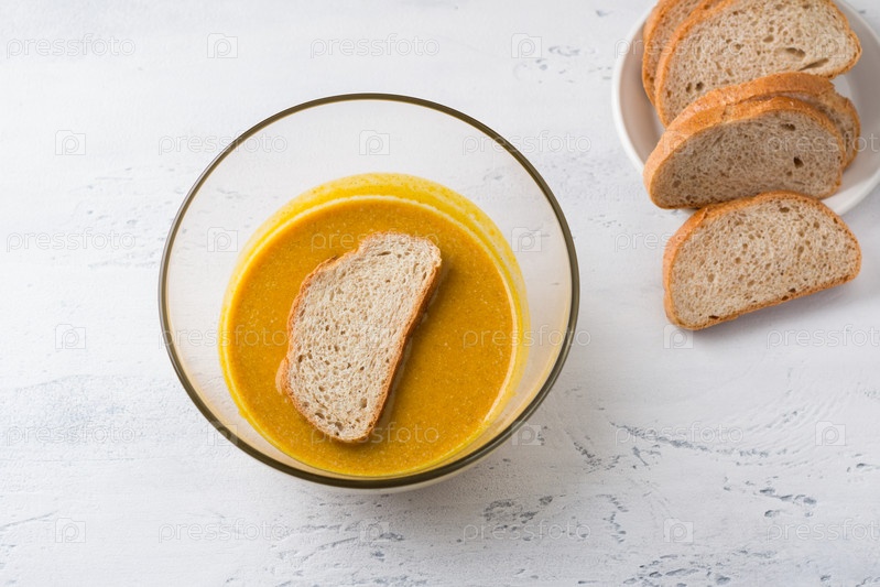 Кусок зернового хлеба обмакивают в пряную тыквенную смесь на светло-голубом фоне, вид сверху. Этап приготовления вкусных тыквенных тостов