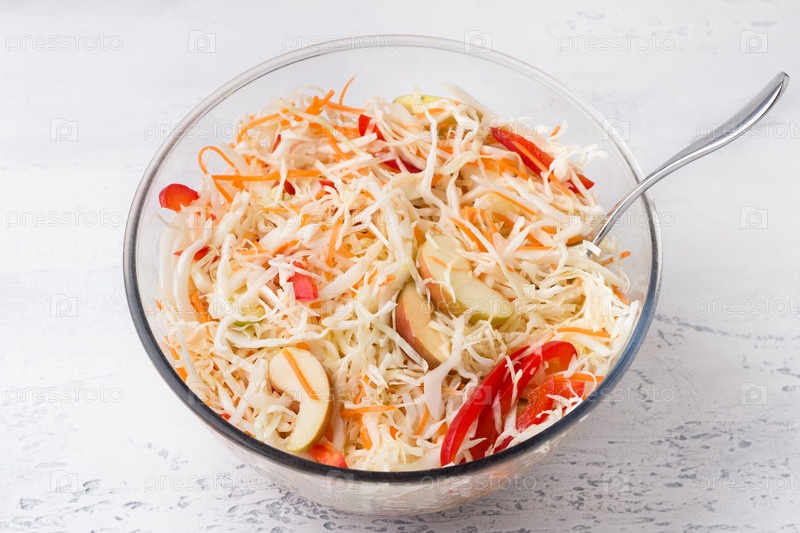 Стеклянная миска с нашинкованной капустой с тертой морковью, яблоками и сладким перцем на светло-сером фоне. Готовим вкусную домашнюю еду