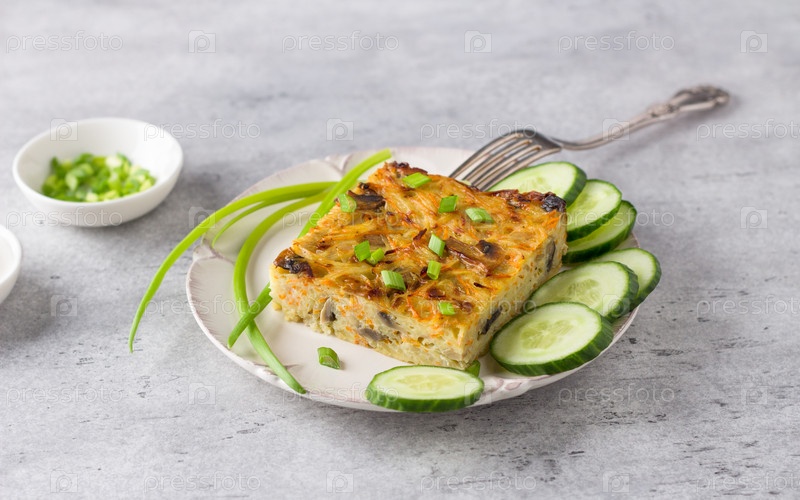Овощная запеканка, кугель, из картофеля, моркови и грибов с ломтиками огурца и зеленым луком на сером фактурном фоне. Вкусная вегетарианская кухня