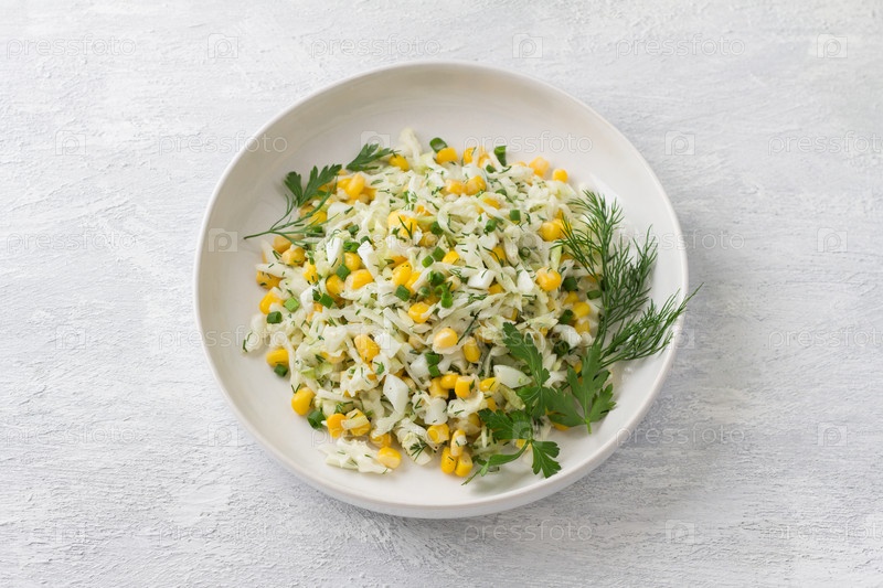 Белая керамическая миска с вегетарианским салатом из капусты с кукурузой, яйцами, зеленью, майонезом на светло-сером фоне