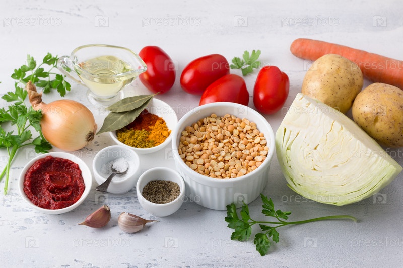 Ингредиенты для овощного рагу: горох, картофель, капуста, морковь, лук, чеснок, помидоры, растительное масло, томатная паста, зелень, соль и специи на светло-голубом фоне. Готовим вкусную веганскую еду