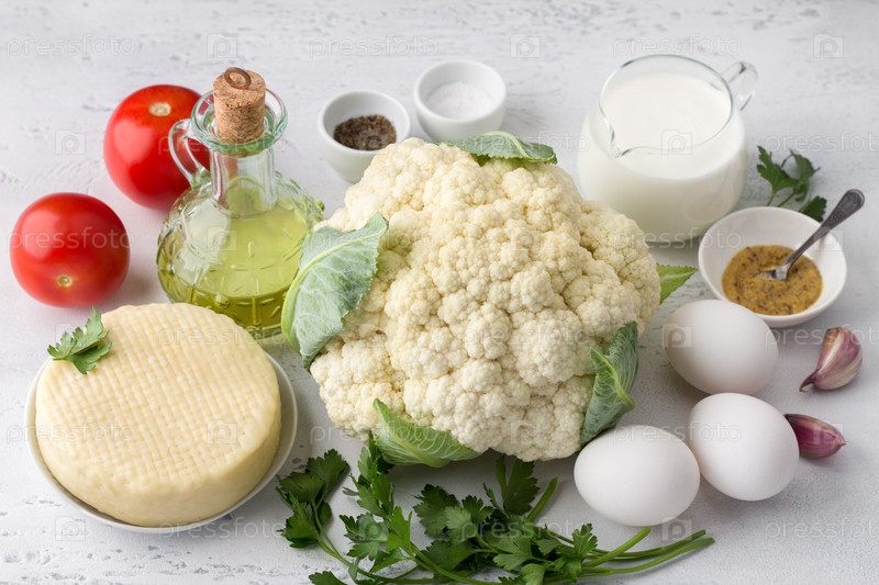 Ингредиенты для запеканки из цветной капусты с помидорами и сыром: цветная капуста, помидоры, сыр, чеснок, яйца, сливки, соль, перец, растительное масло и зелень, на светло-сером фоне. Готовим домашнюю еду