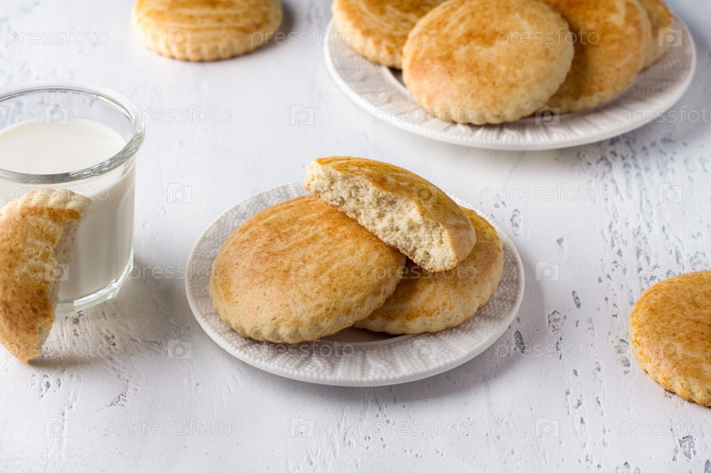 Сладкие молочные коржики со стаканом молока на светло-голубом фоне. Традиционная русская домашняя выпечка