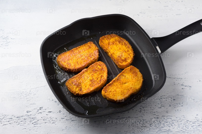 Сладкие жареные тыквенные тосты с имбирем и корицей на сковороде на светло-голубом столе, вид сверху. Этап приготовления