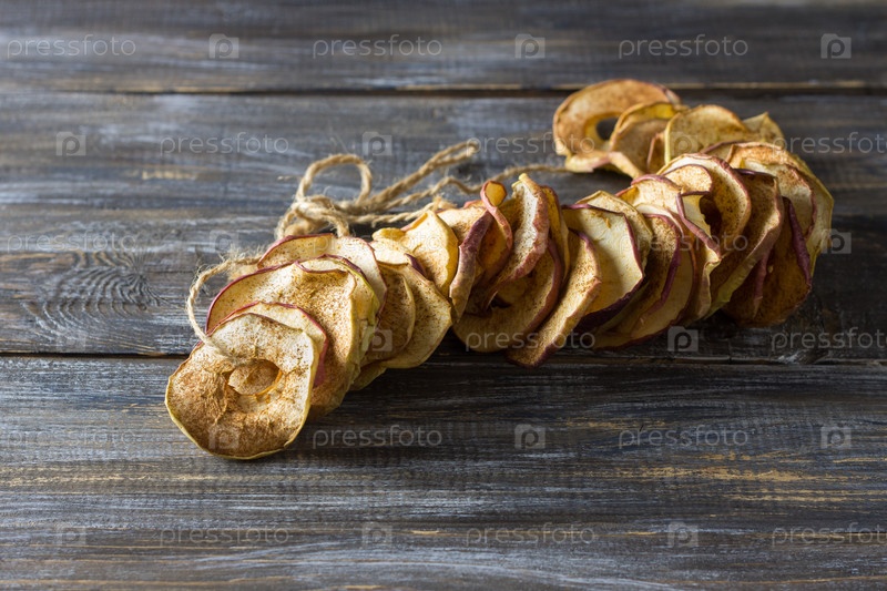 Домашние сушеные яблоки с корицей, яблочные чипсы на деревянном фоне. Вкусная здоровая закуска