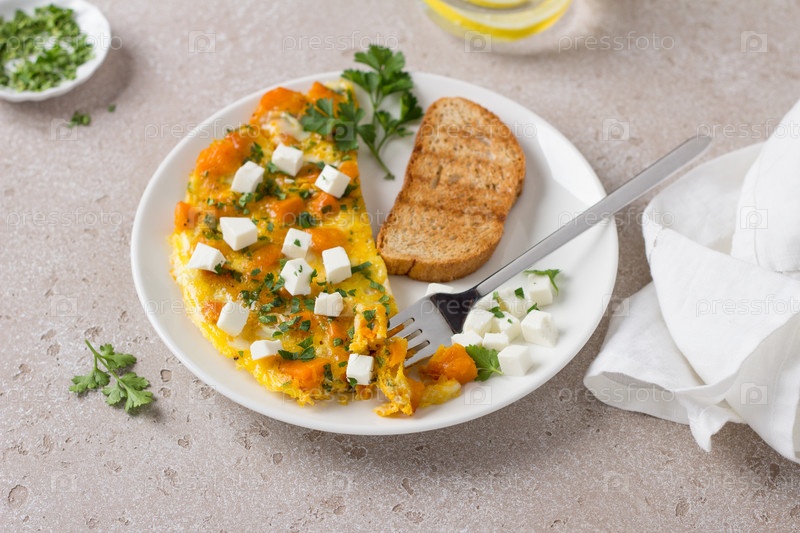 Яичница-болтунья омлет с тыквой и фетой на белой тарелке с тостами и зеленью на бежевом текстурированном фоне. Вкусный домашний завтрак