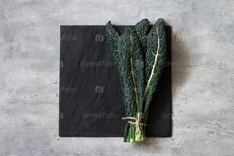 Связка черной тосканской капусты, каволо неро или лачинато на черной грифельной доске на сером текстурированном фоне, вид сверху