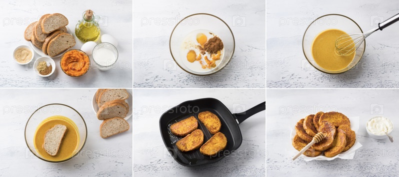 Приготовление сладких тыквенных тостов с корицей и имбирем, коллаж, шаг за шагом, своими руками, ингредиенты, этапы приготовления, финальное блюдо на светло-голубом столе