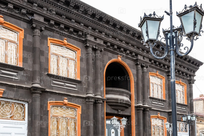 Фонарь и старый дом из черного туфа в Гюмри