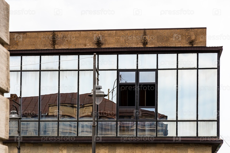 Отражение здания в стеклянном зеркале балкона