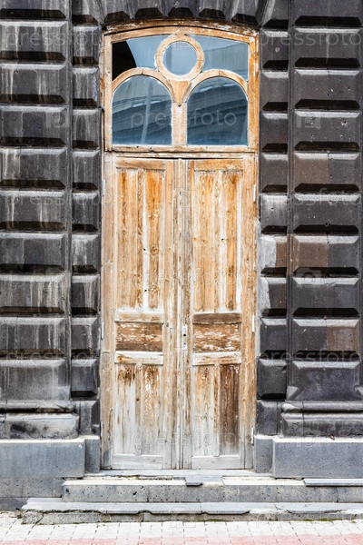 Потертая деревянная дверь в старом доме из черного туфа