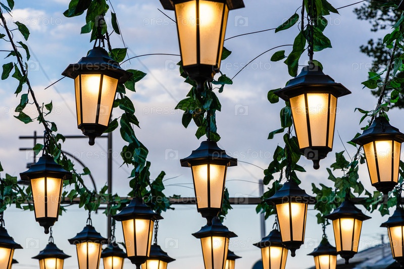 Много электрических уличных фонарей в летних сумерках