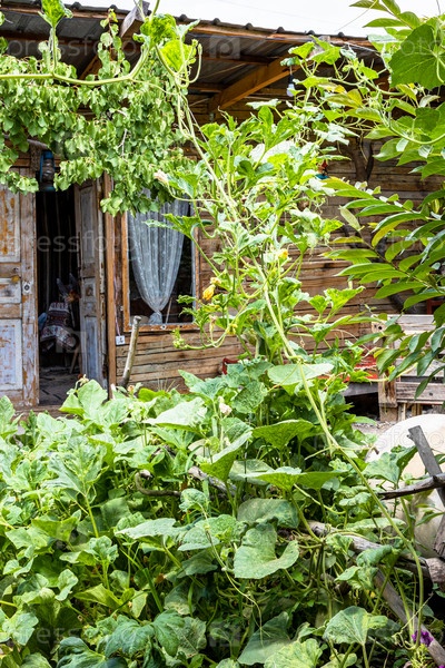 Деревянная хижина в зеленом саду в деревне, Армения