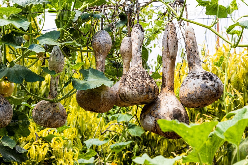 Спелые плоды тыквы калебас на виноградных лозах в саду