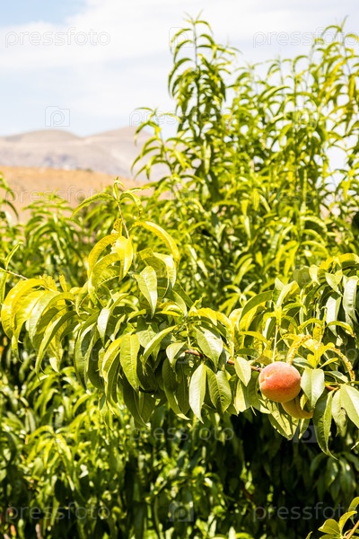 Персиковое дерево в саду и вид на горы