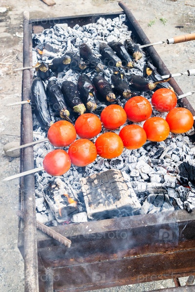 Нанизанные на шампуры свежие овощи жарятся на мангале