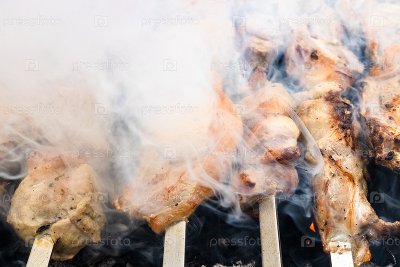 Приготовление на гриле нанизанных на шампур кусочков свинины крупным планом