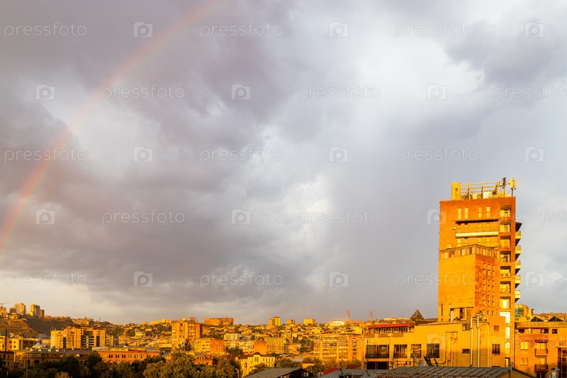 Радуга в сером облачном небе над Ереваном