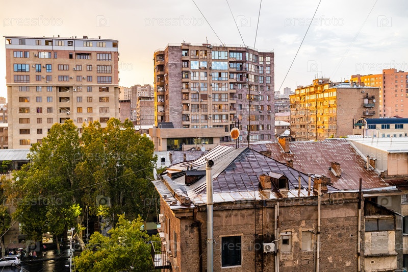 Многоквартирные дома в городе Ереван на закате