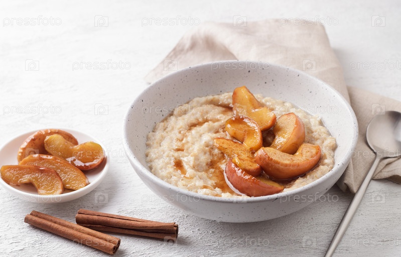 Сладкая овсяная каша с дольками печеного яблока, корицей и карамельным соусом