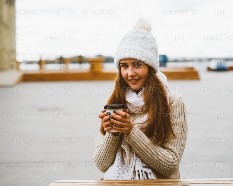 Красивая молодая девушка смотрит в камеру, держа кофе, чай в многоразовой пластиковой кружке осенью, зимой. Женщина в теплой одежде сидит на набережной Балтийского моря в порту, согретая горячим напитком
