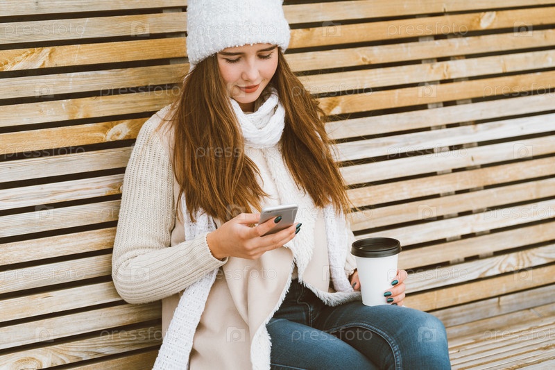 Красивая молодая девушка пьет кофе, чай из пластиковой кружки осенью, зимой и разговаривает по мобильному телефону. Женщина с длинными волосами сидит на скамейке осенью или зимой, греясь в горячем напитке, копировальное пространство