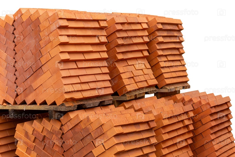 Штабеля нового красного керамического кирпича, сложенные на деревянных поддонах. Много нового оранжевого кирпича для строительства стены и текстуры. Избирательный фокус. Изолирован на белом