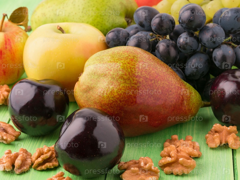 Набор фруктов на зеленом деревянном столе