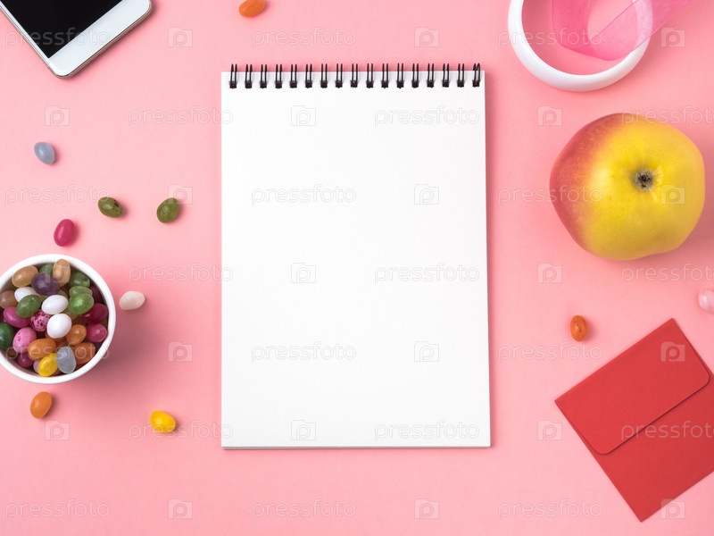 Открытая тетрадь с чистым белым листом, карамель, леденцы, телефон, яблоко