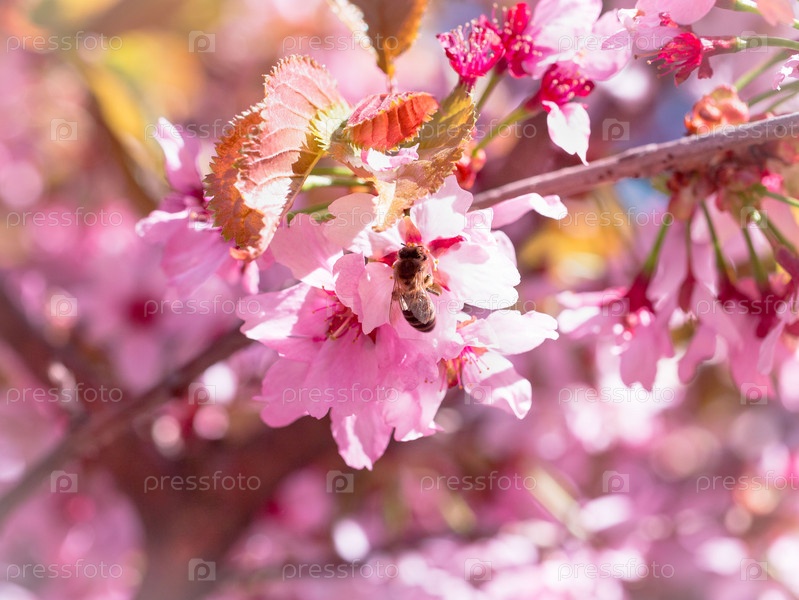 Насекомое пчела полетело на ветку цветущей вишни, собирая нектар. Солнечный день весной